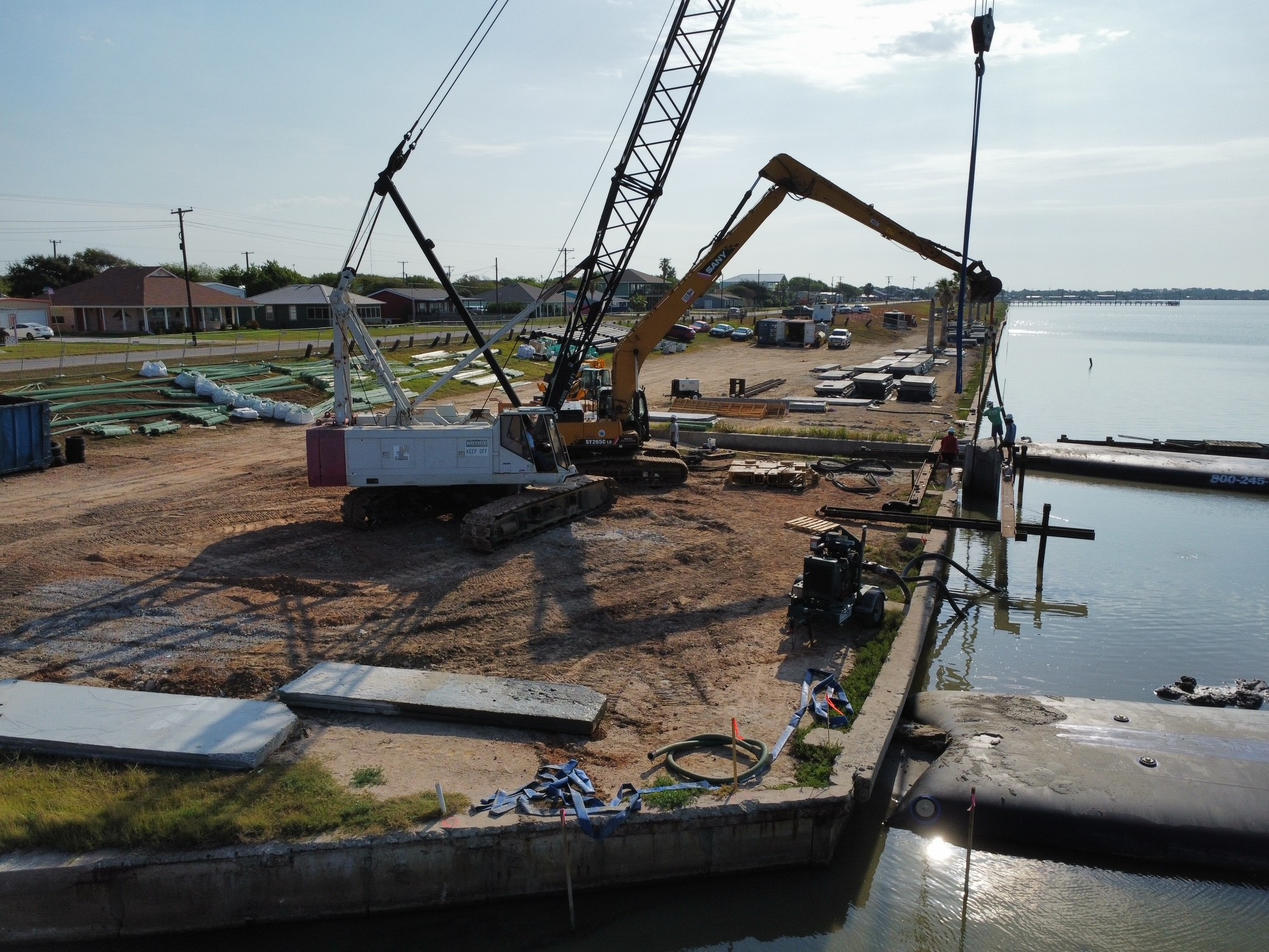During construction SR Trident was met with many challenges when attempting to drive sheet piles into the bay’s floor. One doesn’t have to imagine that after a devastating storm like Harvey, there would be plenty of debris to remove from the work area. Some of the debris SR Trident removed included bathtubs, pieces of wooden docks which were washed away and even an entire car was submerged in the work area!